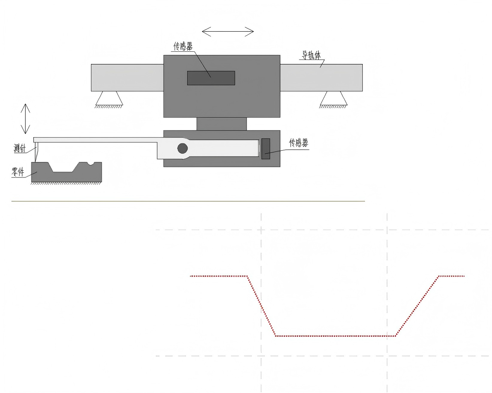 轮廓仪的采用直角坐标测量法,其测量原理为:通过 X 轴、Z1轴传感器,测绘出被测零件的表面轮廓的离散二维坐标点(点云数据)。通过电气组件,将传感器所测量的坐标点数据传输到上位PC机,软件对所采集的原始坐标数据进行数学运算处理,标注所需的工程测量项目。