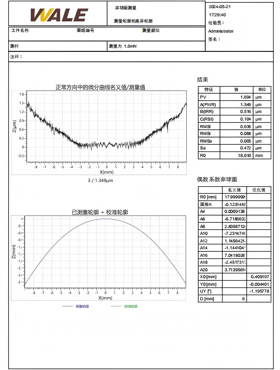 非球面镜片:通过输入非球面函数或理论非球面曲线,与实际非球面产品测量进行对比。
