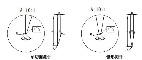 测量时,测针圆锥处母线与被测轮廓接触,属于线接触,对测量干涉小,多用于螺纹、丝杆等零件的测量和直径<10mm的内轮廓的测量。