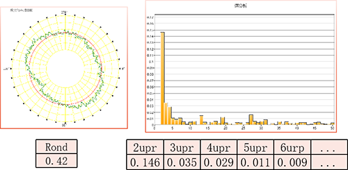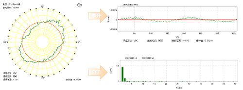 采用半径测量法,以精密转轴为测量基准。使用精密位移传感器和角向传感器获取被测件的圆轮廓数据,经快速傅立叶(FFT)变换成频域信号,得出每一单一频率(UPR)的幅值。如图: